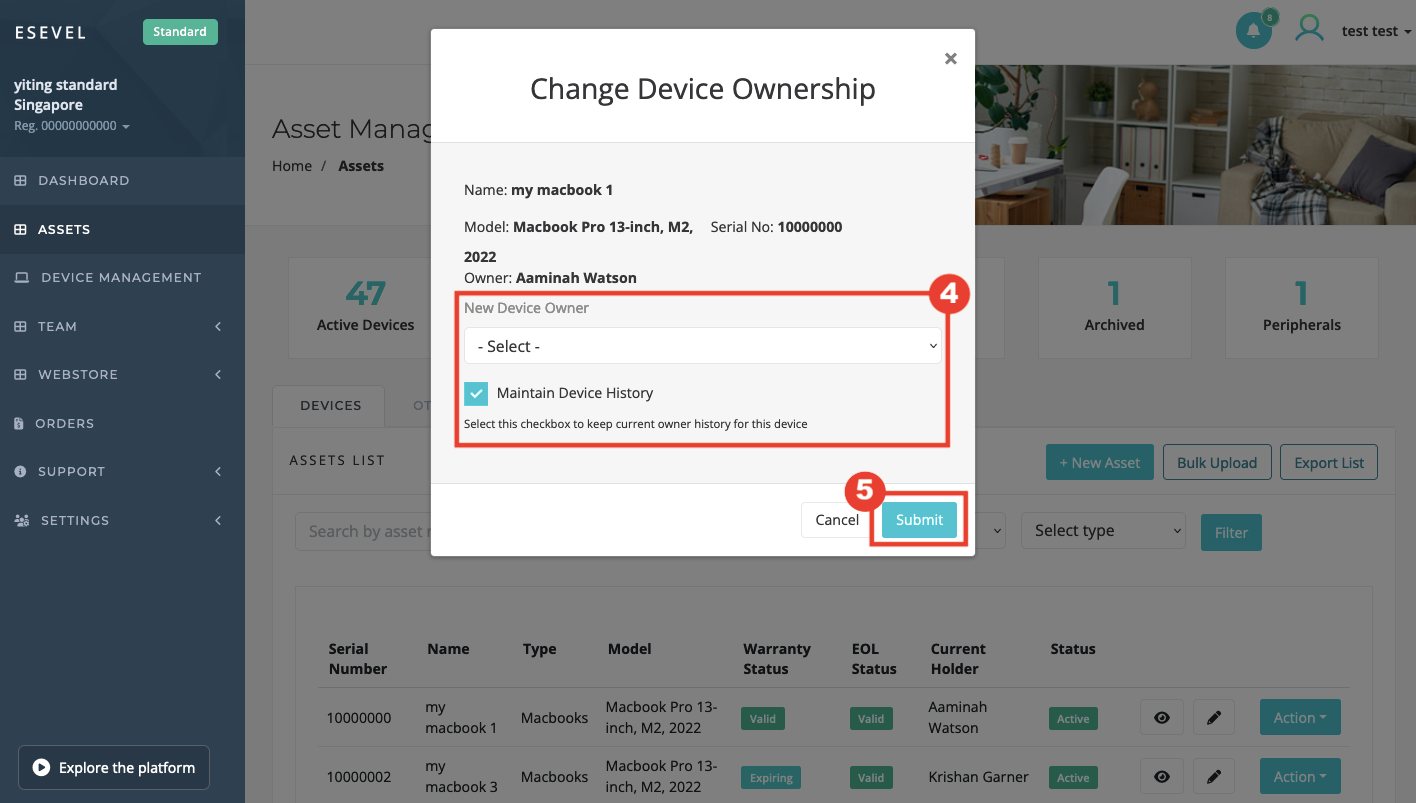 4. Select New Device Owner from the dropdown list and Tick the box Maintain Device History if you want to maintain the device history.